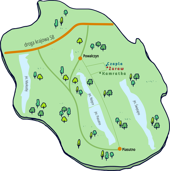Jadąc drogą krajową 58 ze Szczytna w stronę Mikołajek skręć w prawo za wsią Marksewo. Masz dwie możliwości: albo dobrze oznakowanym zjazdem na Świętajno albo kawałek dalej na wieś Powałczyn. Tam wypatruj naszych drogowskazów :)